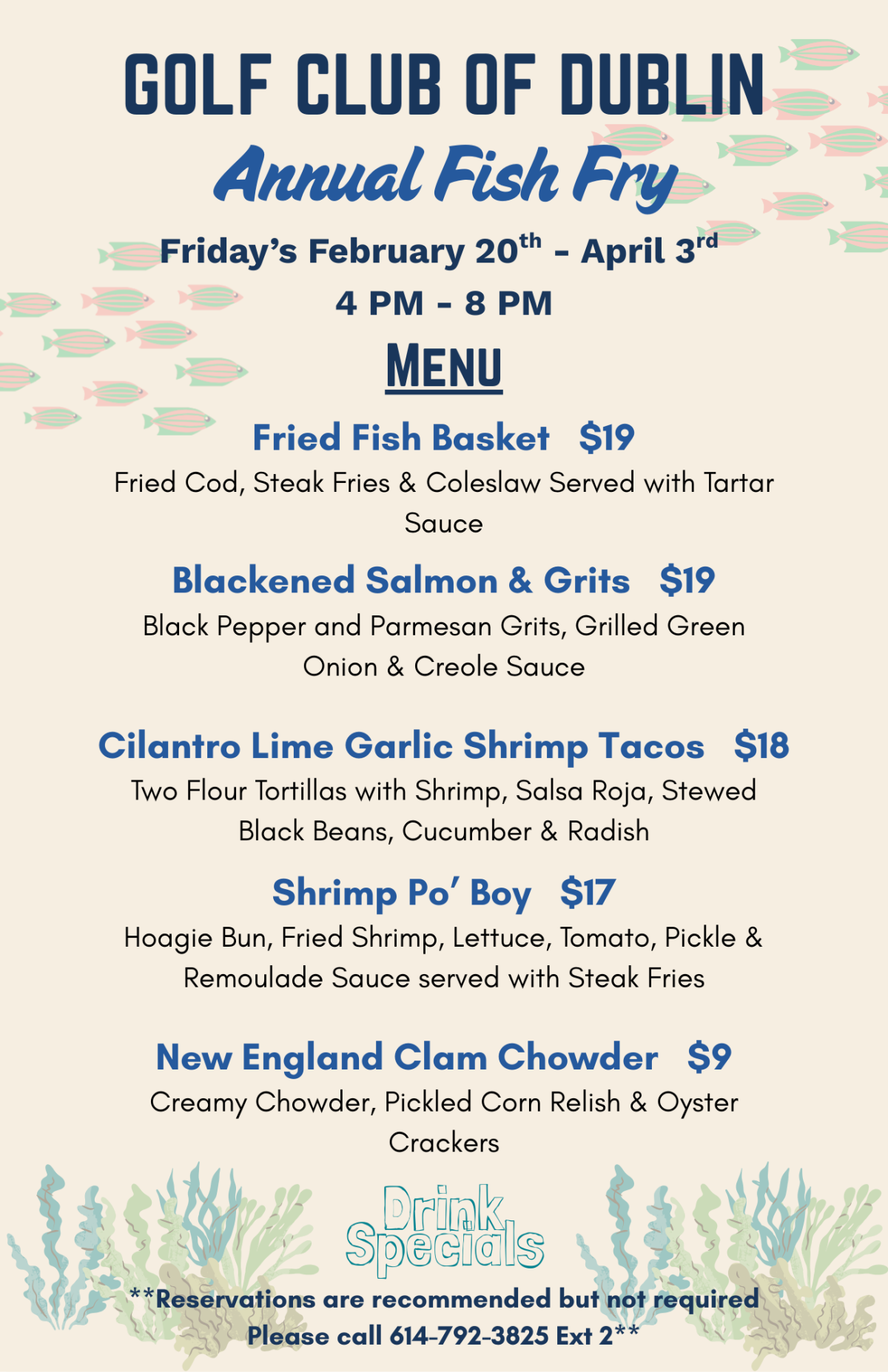 Fish Fry Fridays Are Back at the Golf Club of Dublin! Join us for our Annual Fish Fry Fridays, starting this Friday, February 20th, and running on Fridays through April 3rd! From 4 PM to 8 PM, enjoy delicious seafood favorites, cold drinks, and a great atmosphere. On the Menu: -Fried Fish Basket – Fried Cod, steak fries & coleslaw served with tartar sauce. ($19) -Blackened Salmon […]