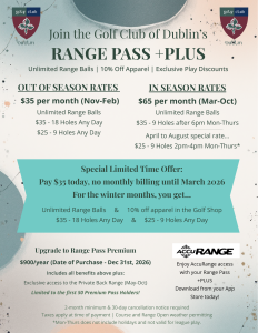 -Our Range Pass Program is now back to monthly billing. You all told us how much you enjoyed this and we have brought it back. The Range Pass Plus has new perks for 2026 which is valid for the Golf Club of Dublin only.